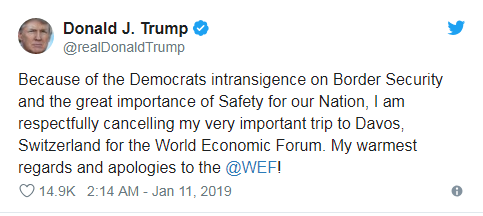 特朗普表示,由于民主黨在邊境安全問題上的頑固態(tài)度和國家安全的重要性,他謹(jǐn)慎地取消前往瑞士達(dá)沃斯參加世界經(jīng)濟論壇的行程,并向世界經(jīng)濟論壇致以問候和歉意。另外,美國政府高級官員表示,即使本月晚些時候政府仍處于關(guān)閉狀態(tài),美國財政部長姆努欽將帶領(lǐng)美國政府代表團(tuán)出席達(dá)沃斯論壇。