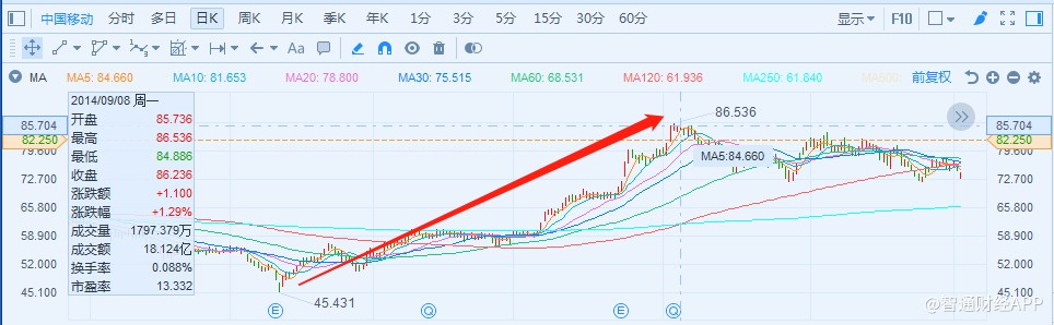 2013年12月4日,工業(yè)和信息化部正式向三大運營商發(fā)放了4G牌照。隨后的2014年,見證了4G前期的陣痛和后期的爆發(fā)。也在這一年,中國移動股價上漲了21.32%。