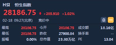恒生指數(shù)開盤漲285.91點(diǎn)或1.02%,報(bào)28186.75點(diǎn)。國(guó)企指數(shù)漲1.1%,報(bào)11057.72點(diǎn)。紅籌指數(shù)漲1.07%,報(bào)4499.71點(diǎn)。大市盤前成交18.16億港元。