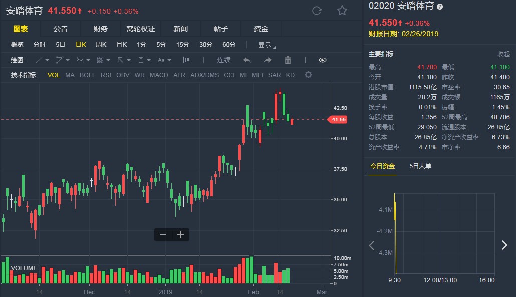 截至發(fā)稿,安踏體育(02020)升0.36%,報(bào)41.550港元。(劉大洋)