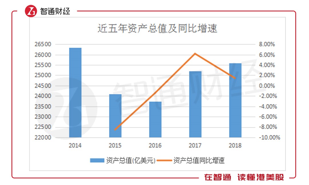 2018年,匯豐控股資產(chǎn)總值規(guī)模達26341.39億美元,較2017年同比增長1.44%,增速有所放緩。追溯歷史,匯豐控股總資產(chǎn)規(guī)模下降開始于2012年,自2015年起降幅縮小,并重新擴表。至2017年達到大幅正增長,而于去年增速放緩。