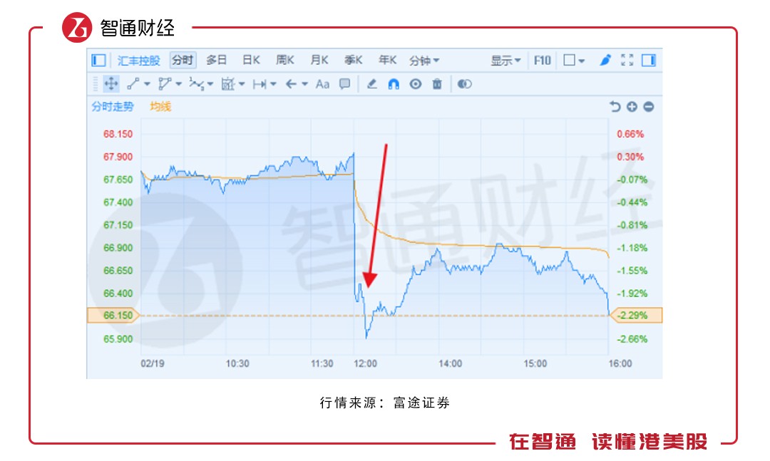 自午間業(yè)績公布后,匯控股價出現(xiàn)斷崖式下跌,雖隨后有所回升,但整體依舊無力回天,最終以66.15港元收尾,跌幅2.29%。