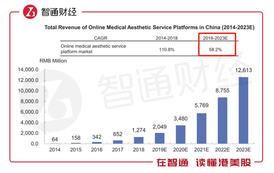 因此,近年來的線上醫(yī)美平臺憑借自身的優(yōu)勢快速崛起。從2018-2023年,線上醫(yī)美市場預計的年復合增長率為58.2%,遠快于整體醫(yī)美市場的增長速度。