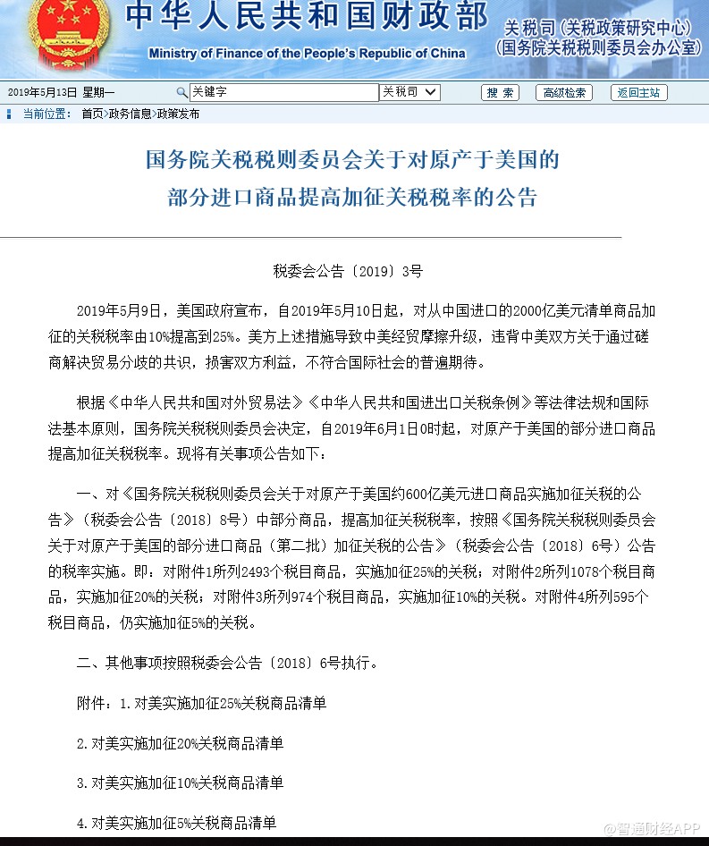 智通財經(jīng)APP獲悉,據(jù)財政部官網(wǎng)消息,2019年5月9日,美國政府宣布,自2019年5月10日起,對從中國進(jìn)口的2000億美元清單商品加征的關(guān)稅稅率由10%提高到25%。美方上述措施導(dǎo)致中美經(jīng)貿(mào)摩擦升級,違背中美雙方關(guān)于通過磋商解決貿(mào)易分歧的共識,損害雙方利益,不符合國際社會的普遍期待。
