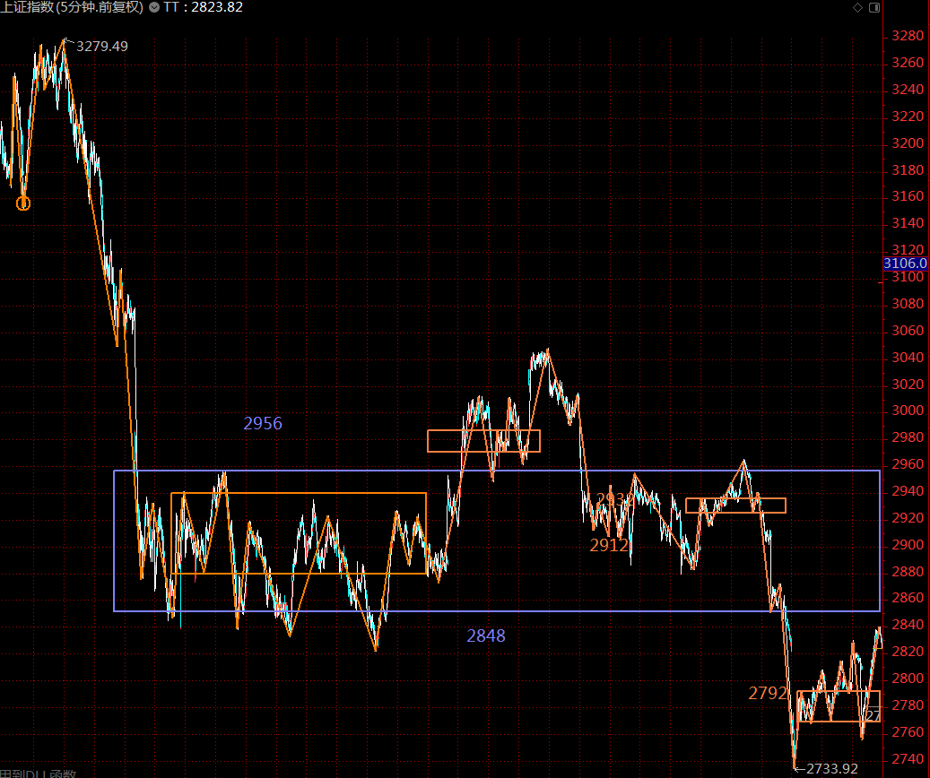 上周市場整體都處在構(gòu)建第三類賣點的階段,周五的高點2840目前初步確認為第三類賣點的精確位置,如果就此轉(zhuǎn)下,下一步2792點就顯得尤為重要,如果往下的五分鐘線段未能跌破2792點,那這個位置是一個合理的建倉點,等同于針對下方三十分鐘中樞(九段擴張)的第三類買點。
