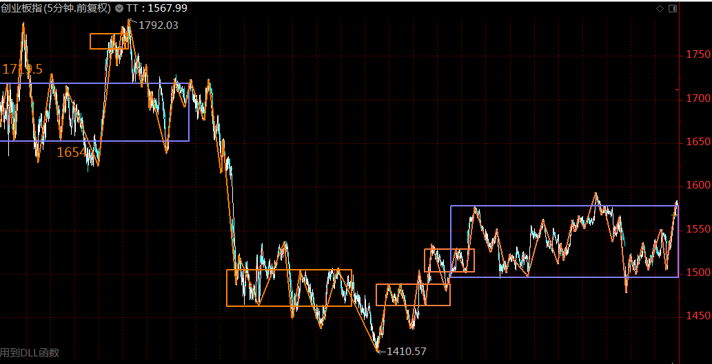 創(chuàng)業(yè)板這里走的比主板強勢很多,周四的陽線直接修復(fù)了形態(tài),目前在三十分鐘中樞內(nèi)部運行,中樞上軌1577點,周五已經(jīng)頂?shù)搅酥袠猩宪?,如果下周能突破此中樞,等五分鐘回落線段后構(gòu)建三買,可大膽介入做多。