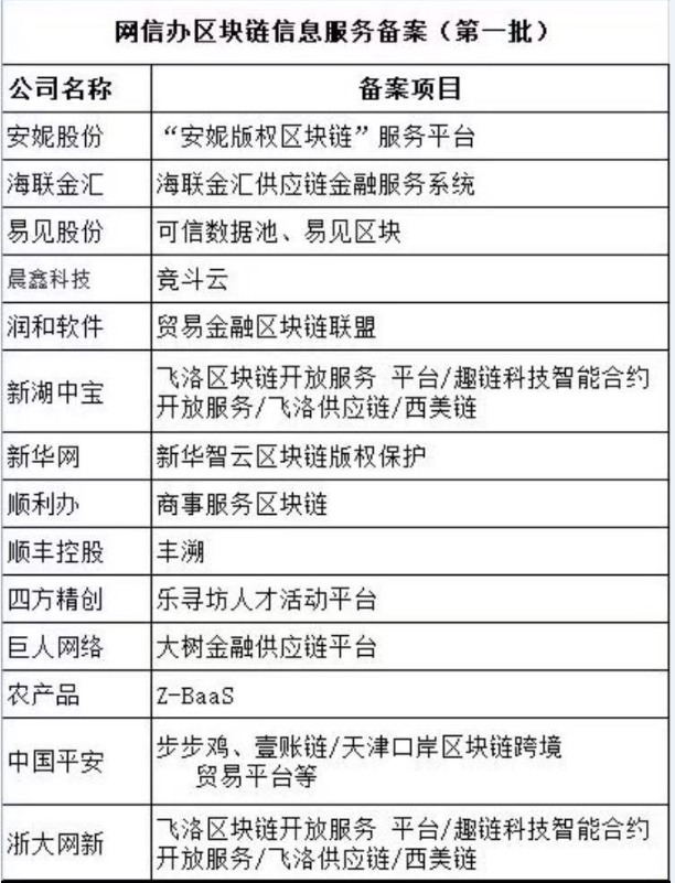 第一批區(qū)塊鏈信息服務(wù)備案于3月30日發(fā)布:A股公司涉及安妮股份、海聯(lián)金匯、易見股份、晨鑫科技、潤和軟件、新湖中寶、新華網(wǎng)、順利辦、順豐控股、四方精創(chuàng)、巨人網(wǎng)絡(luò)、農(nóng)產(chǎn)品、中國平安、浙大網(wǎng)新。