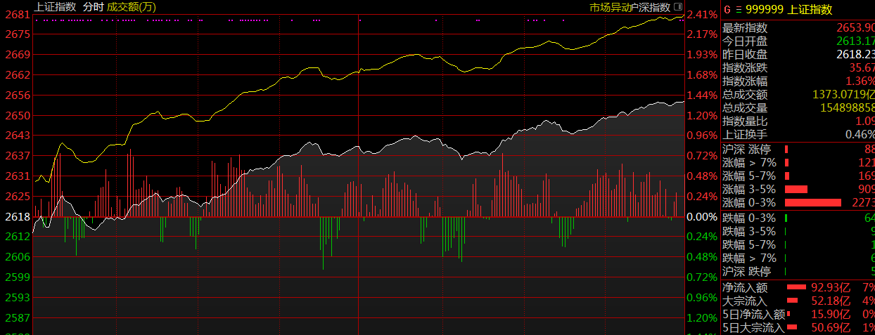 兩市今日平開,隨后氫燃料電池、券商板塊攻勢再起推動指數(shù)沖高,早盤兩市震蕩走強。午后指數(shù)持續(xù)拉升,大消費板塊崛起,白酒板塊受資金追捧領漲市場,市場人氣比較活躍。