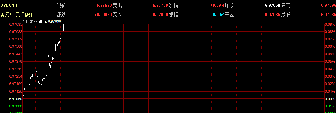 10月30日,離岸人民幣兌美元匯率再度跌破6.97關(guān)口,盤中觸及6.9773低點,創(chuàng)10年來新低。截至19時15分報6.9732,貶值16基點:在岸人民幣即期匯率報6.9639,貶值17基點。