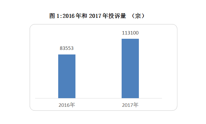 2017年,深圳市、區(qū)消委會(huì)共接受消費(fèi)者投訴113100宗,比2016年的83553宗增長(zhǎng)了35.36%?!?15消費(fèi)通”系統(tǒng)來(lái)源投訴65065宗占比58%,12315電話來(lái)源投訴45888宗占比41%,可見(jiàn)“315消費(fèi)通”系統(tǒng)已經(jīng)成為消費(fèi)者投訴主要方式。