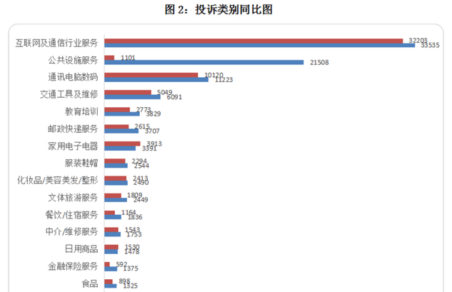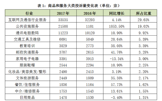 2017年,商品和服務(wù)二十五大類投訴中,互聯(lián)網(wǎng)及通信行業(yè)服務(wù)、公共設(shè)施服務(wù)、通訊電腦數(shù)碼投訴量居前三位,均超過(guò)1萬(wàn)宗,分別占投訴總量的29.65%、19.02%和9.92%。