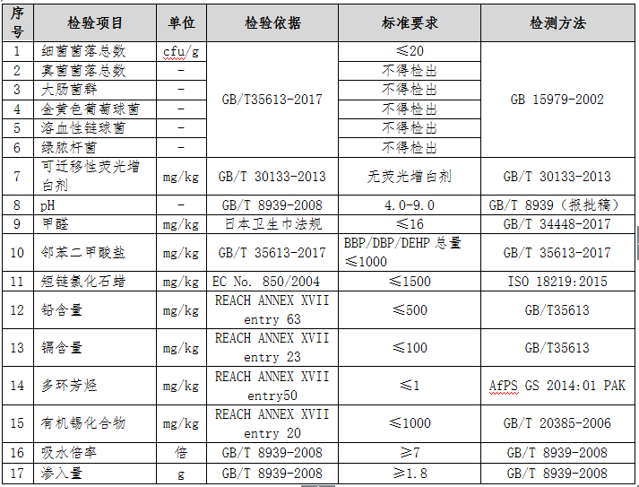 2. 甲醛含量參考日本衛(wèi)生巾及直接接觸皮膚相關(guān)產(chǎn)品法規(guī)中≤16mg/kg的要求,該指標(biāo)要求高于GB/T35613-2017《綠色產(chǎn)品評價 紙和紙制品》標(biāo)準(zhǔn)中甲醛含量≤75mg/kg的要求。 3.針對消費者高度關(guān)注的衛(wèi)生巾具有熒光增白劑問題,在本次比較試驗中考核“可遷移性熒光物質(zhì)”要求為:不得檢出。
