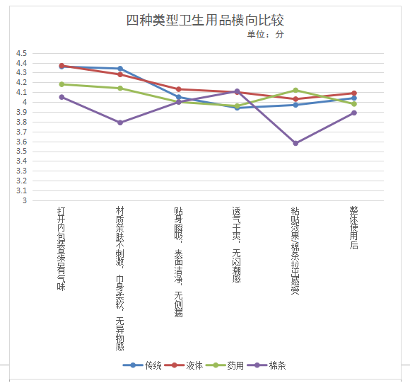 在“打開內(nèi)包裝是否有氣味”體驗中,液體材料衛(wèi)生巾平均得分4.37分,備受好評;傳統(tǒng)衛(wèi)生巾次之。