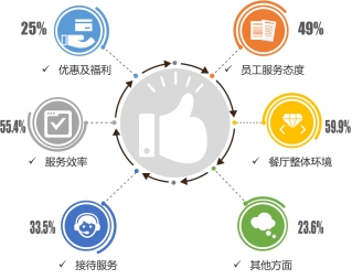 本次調(diào)查從餐廳整體環(huán)境、服務(wù)效率、員工服務(wù)態(tài)度、接待服務(wù)、優(yōu)惠及福利及其他方面等六個(gè)維度展開(kāi),其中餐廳整體環(huán)境與服務(wù)效率是消費(fèi)者最主要推薦的原因,餐廳整體環(huán)境推薦比例最高,為55.9%。