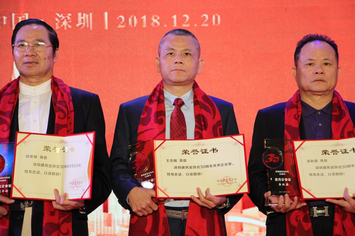 本次慶典上,深圳建筑業(yè)協(xié)會(huì)表彰了一批在促進(jìn)、推動(dòng)深圳建筑行業(yè)發(fā)展中作出重大貢獻(xiàn)的優(yōu)秀企業(yè)和個(gè)人,鼓勵(lì)他們不斷探索創(chuàng)新,共同創(chuàng)造深圳建筑業(yè)的輝煌。深圳市建被授予“30周年優(yōu)秀施工企業(yè)”;翠林投資集團(tuán)董事長(zhǎng)王忠明榮獲深圳建筑業(yè)協(xié)會(huì)“30周年優(yōu)秀企業(yè)家”稱號(hào);深圳市建員工盧燦光、郝崇民榮獲“30周年優(yōu)秀項(xiàng)目經(jīng)理”稱號(hào);深圳市建老員工李炳坤榮膺“30周年優(yōu)秀工匠”稱號(hào)。