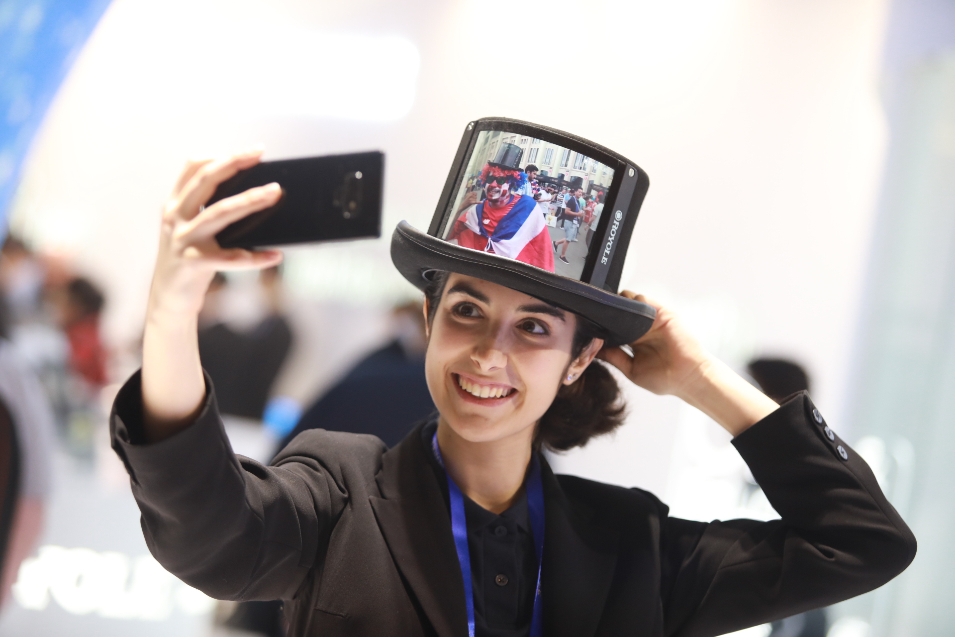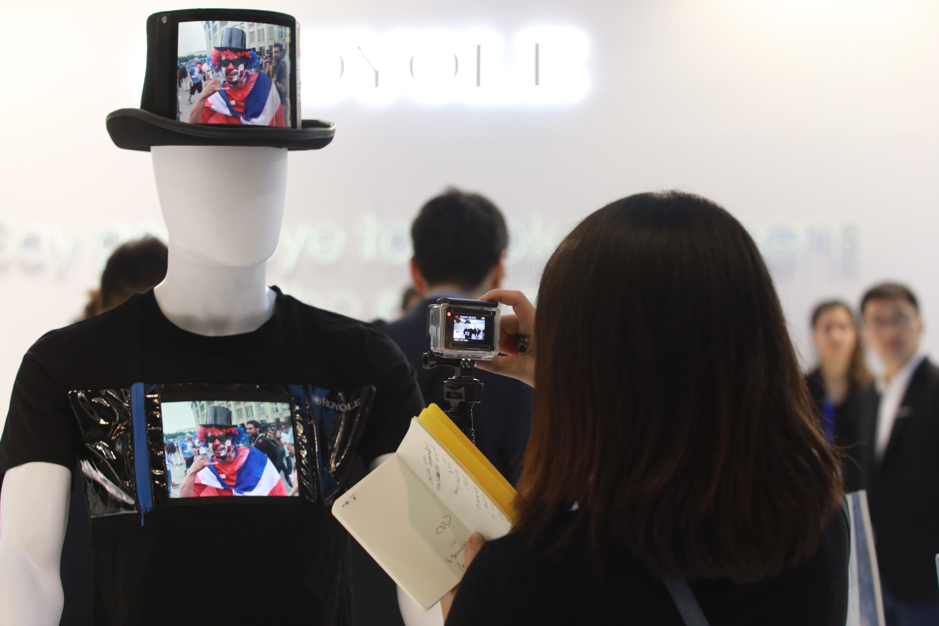 法國一女士體驗(yàn)高清柔性屏?xí)r尚衣帽后對柔宇工作人員說:"柔性屏?xí)r尚衣帽套裝超酷,這個(gè)如果能穿去派對的話就太完美了。"