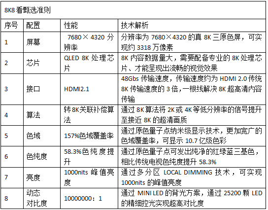 在行業(yè)趨勢(shì)及國(guó)家政策的雙重推動(dòng)下,為正確引導(dǎo)8K電視市場(chǎng)發(fā)展方向、加快發(fā)展步伐,TCL聯(lián)合國(guó)家廣播電視產(chǎn)品質(zhì)量監(jiān)督檢驗(yàn)中心經(jīng)過長(zhǎng)時(shí)間的市場(chǎng)調(diào)研及總結(jié),從行業(yè)整體的角度對(duì)8K電視進(jìn)行了初步探討,并編制出《8K8看甄選白皮書》。這份白皮書告訴我們,實(shí)現(xiàn)真正的8K震撼視覺體驗(yàn)關(guān)鍵性能/技術(shù)要求如下。