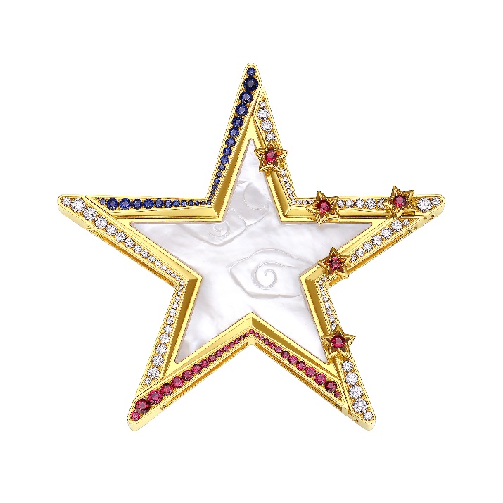 作為本次發(fā)布會主角,周大福17916系列新品“宸”曾作為第11屆“法國圣埃蒂安國際設計雙年展”參展作品,在世界舞臺上綻放過光芒。“五角星”的造型融入了法國國旗藍、白、紅三色和中國國旗的五角星元素,代表了中法兩國的交流與合作,雙方希望通過宸這樣意義深遠的產(chǎn)品,見證和促進兩國的和平發(fā)展與經(jīng)濟交流。“宸”以北極星為靈感來源,寓意點亮年輕人的生活與夢想。別具一格的五角星設計藝術(shù)感十足,鉆石與22K金的加持,更讓整個作品展現(xiàn)出奪目光彩。白貝母項鏈外圈圍以鉆石、寶石,一款三戴,幻化無限魅力。簡潔的五角星造型,干凈有力,猶如夜空中指引前行的明星。