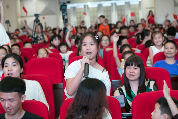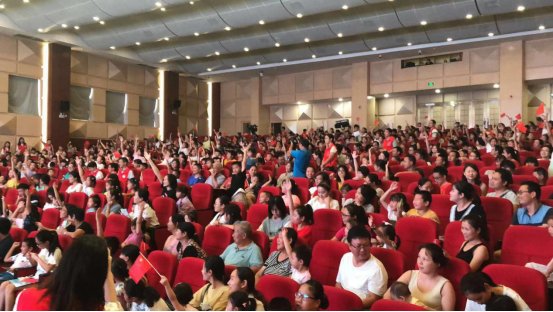 接下來,為進(jìn)一步增強(qiáng)青少年兒童的愛國意識,主辦方將戲劇教育與愛國教育有機(jī)融合,于文明知識問答后,邀請近千名觀眾一起舞動小紅旗,齊聲唱響《我和我的祖國》,點燃了在場每一位觀眾的愛國熱情,觀眾們跟隨著旋律,共同歌唱祖國,深情祝福祖國明天更加輝煌。