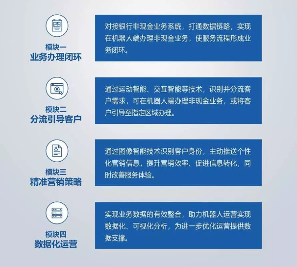 人工智能機器人與金融業(yè)務(wù)的完美結(jié)合,助力加速金融網(wǎng)點智能化建設(shè)、提升營銷效率、豐富金融營銷場景。