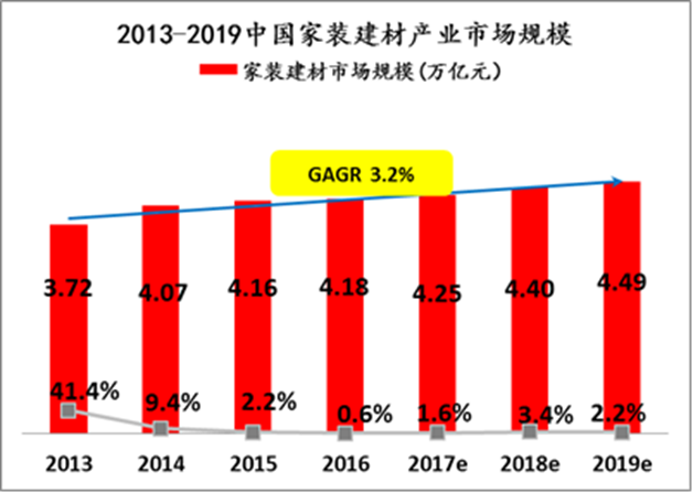 億歐智庫(kù)數(shù)據(jù)顯示,目前家裝市場(chǎng)復(fù)合年增長(zhǎng)率維持在3.2%,2019年家裝市場(chǎng)銷(xiāo)售規(guī)模接近4.5萬(wàn)億,但家裝建材互聯(lián)網(wǎng)滲透率小于10%,經(jīng)營(yíng)模式以傳統(tǒng)的區(qū)域性“散打”為主,無(wú)法滿足90后主體消費(fèi)者互聯(lián)網(wǎng)化、社交化、全國(guó)性購(gòu)買(mǎi)的需求,家裝行業(yè)大整合的呼聲越來(lái)越高。