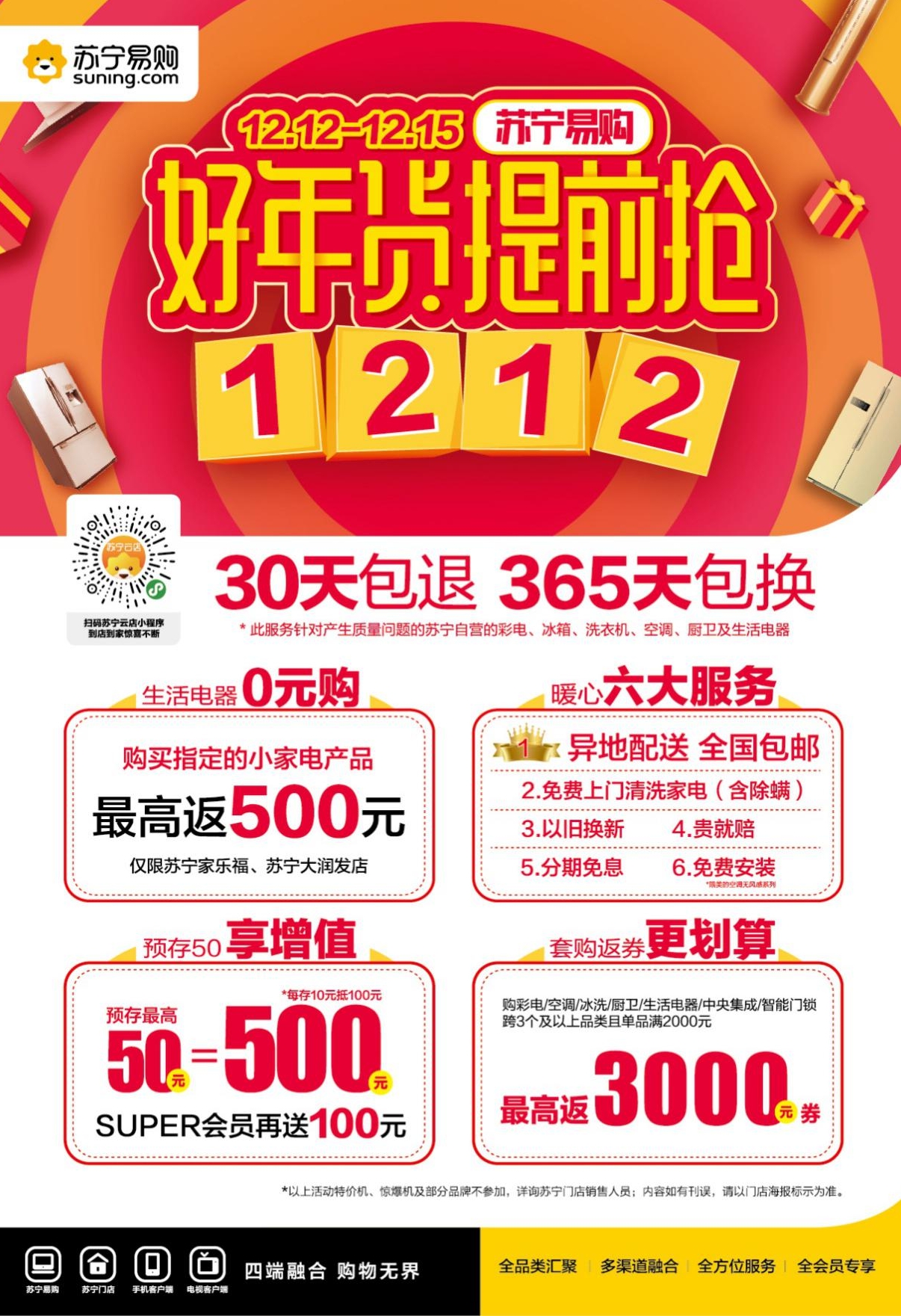 同時,深圳蘇寧還聯(lián)合各大知名品牌為廣大消費者推出了多重超強福利,在活動力度上,預(yù)存50元可抵500元的家電購物抵用券,并且套購多個產(chǎn)品最高可返3000元的優(yōu)惠券。除此之外,蘇寧家樂福、蘇寧大潤發(fā)、蘇寧歐尚聯(lián)合推出生活家電0元購活動,消費者購買生活電器可返產(chǎn)品價格的同等金額,最高省500元。并且雙十二當天在蘇鮮生購物使用蘇寧金融支付新用戶滿50元減20元,老用戶滿30元減10元,12月15日在蘇寧小店購物使用翼支付還可享5折立減。可以預(yù)見,從產(chǎn)品、價格、服務(wù)、活動各個方面不斷提升消費者購物體驗的深圳蘇寧將成為消費者選購年貨的不二選擇。(吳艷)