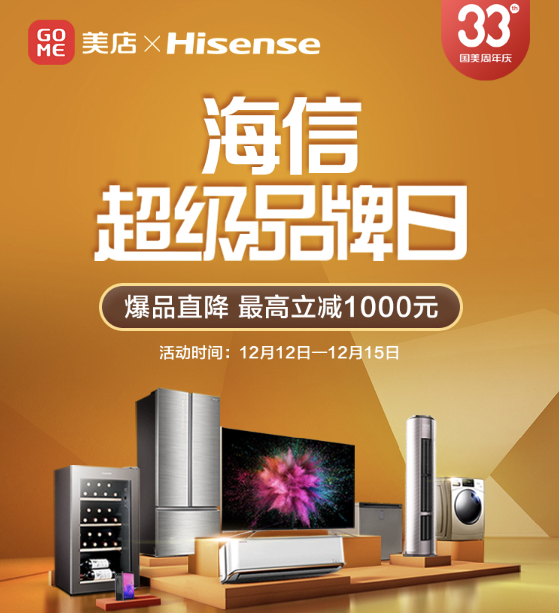 12月12日-15日,33周年生日之際,國美與海爾再度攜手,國美美店帶來海爾超級(jí)品牌日活動(dòng),涵蓋了海爾冰箱、洗衣機(jī)、空調(diào)、電視、廚房衛(wèi)浴等多個(gè)品類豐富產(chǎn)品,多重優(yōu)惠福利、六大承諾保障、延保清洗服務(wù)。