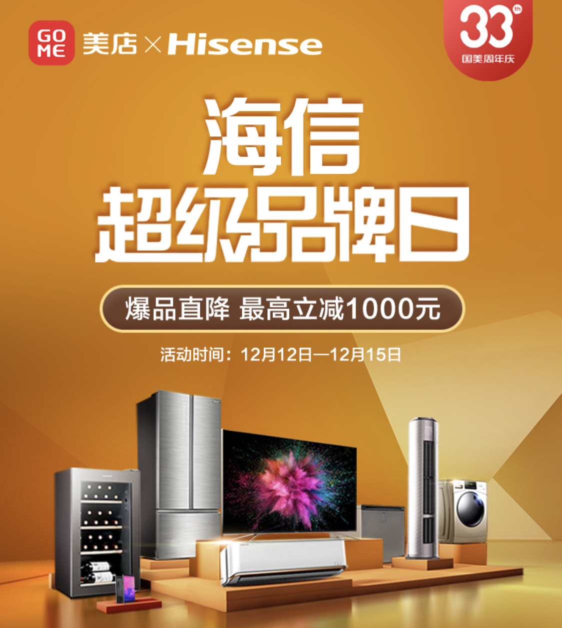 深圳新聞網(wǎng)2019年12月12日訊 12月12日-15日,國(guó)美33周年慶活動(dòng)已經(jīng)啟動(dòng),屆時(shí)消費(fèi)者可在深圳國(guó)美門(mén)店參與“全場(chǎng)好物,第二件5折起”活動(dòng)。同時(shí),海信、海爾、美的超級(jí)品牌日活動(dòng)也將于12日-15日期間在國(guó)美美店展開(kāi)。用戶在國(guó)美APP中美店活動(dòng)專區(qū)便可參與到活動(dòng)中來(lái),下面為大家介紹下本次海信超級(jí)品牌日的重磅爆品,全場(chǎng)最高立減1000元,還有機(jī)會(huì)獲得愛(ài)奇藝四端VIP會(huì)員卡和小度音箱等福利獎(jiǎng)品,不要錯(cuò)過(guò)。