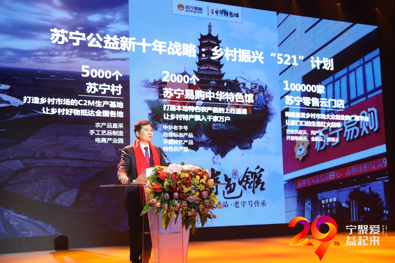 就在12月26日舉行的“蘇寧29周年公益慶生儀式暨新十年公益戰(zhàn)略發(fā)布會”上,蘇寧控股集團董事長張近東發(fā)布了蘇寧鄉(xiāng)村振興“521計劃”,中華特色館是其中重要部分,未來十年要達到2000個。同時,蘇寧村將會建設(shè)至5000個,蘇寧易購零售云門店則將要開到10萬家。張近東表示,“521”取自三個目標(biāo)的首個數(shù)字,同時也寄托著著蘇寧幫扶鄉(xiāng)村、振興鄉(xiāng)村的深切感情。