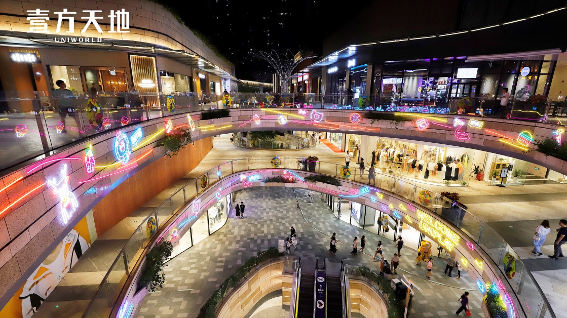 “顏值是第一生產(chǎn)力”,要打造夜間標桿,氛圍營造必不可少。壹方天地將燈飾與建筑、綠植等多個元素巧妙結合,璀璨的景觀燈、夢幻的星星燈、妙趣橫生的IP主題霓虹燈烘托出獨具一格的藝術氛圍。夜晚時分搭配噴泉秀和噴霧,光影夢幻,玉壺光轉,營造出極富層次感的夜景。同時,通過加強外圍的燈光照明等,持續(xù)亮化夜間氛圍,壹方天地成為夜間休閑、聚會的絕佳場所?!跋M者沒事也喜歡來走一走,享受工作之余的休閑時光?!迸藸N峰說道。