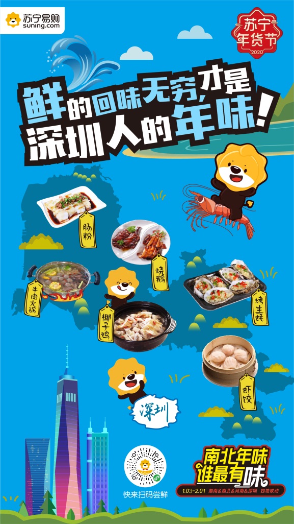 說(shuō)起年味必提到年夜飯,中國(guó)地大物博每個(gè)城市的年夜飯各有特色,究竟哪個(gè)城市的年味最濃,各家眾說(shuō)紛紜。為此華南、華中、華北具有代表性的四個(gè)城市紛紛站出來(lái)為各家城市的年味代言,深圳、武漢、長(zhǎng)沙、鄭州四城分別從年味、年俗、年貨、方言等方方面面為消費(fèi)者獻(xiàn)上了一頓年味大餐。那些記憶里存在的各色過(guò)年儀式,味覺(jué)里保留的故鄉(xiāng)味道,腦海里熟悉的地方鄉(xiāng)音,在這場(chǎng)年味比拼里一一重現(xiàn),喚醒了大家對(duì)于過(guò)年的期許,引發(fā)社交平臺(tái)上大家對(duì)于年味的分享。對(duì)于深圳這個(gè)移民大城往往被貼上沒(méi)有特色年貨的標(biāo)簽,其實(shí)不然,作為嶺南文化重要傳承地的深圳擁有眾多特色年俗。并且隨著越來(lái)越多的人選擇春節(jié)留在深圳過(guò)年,深圳的年味也越來(lái)越濃,因此深圳蘇寧在本次南北年味的話題中,不斷深挖深圳年味,打造了一張?zhí)厣某鞘写汗?jié)名片。