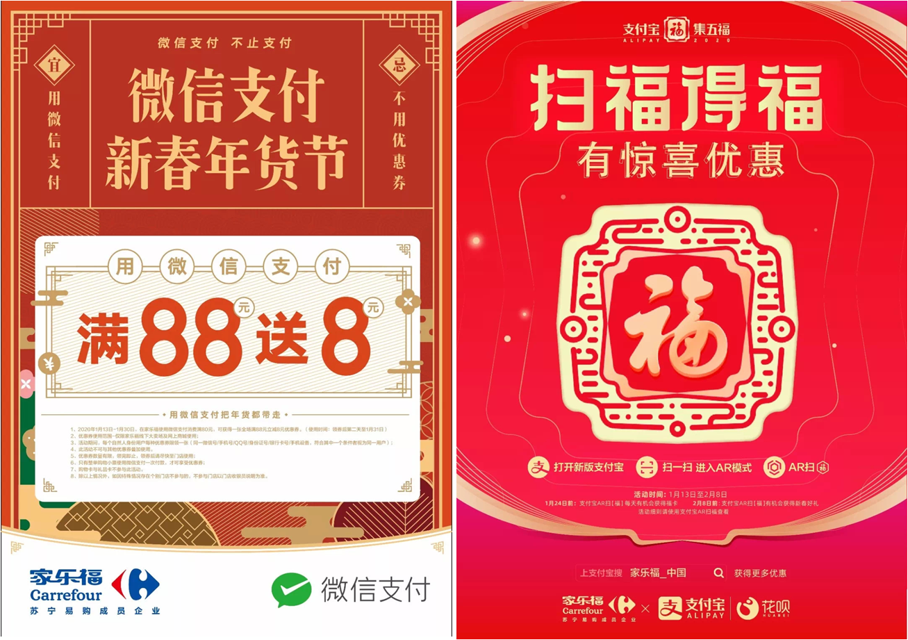 除此之外,各大支付平臺優(yōu)惠券亦開始發(fā)放,助力您的年貨采買。前方高能預(yù)警!1月13日至2月8日,顧客使用支付寶掃上圖“?!弊忠约皡⑴c集五?;顒?,即有機會獲得家樂福全場滿200減10優(yōu)惠券。1月13日至1月30日,在家樂福使用微信支付消費滿80元,可獲得一張全場滿88元立減8元優(yōu)惠券,