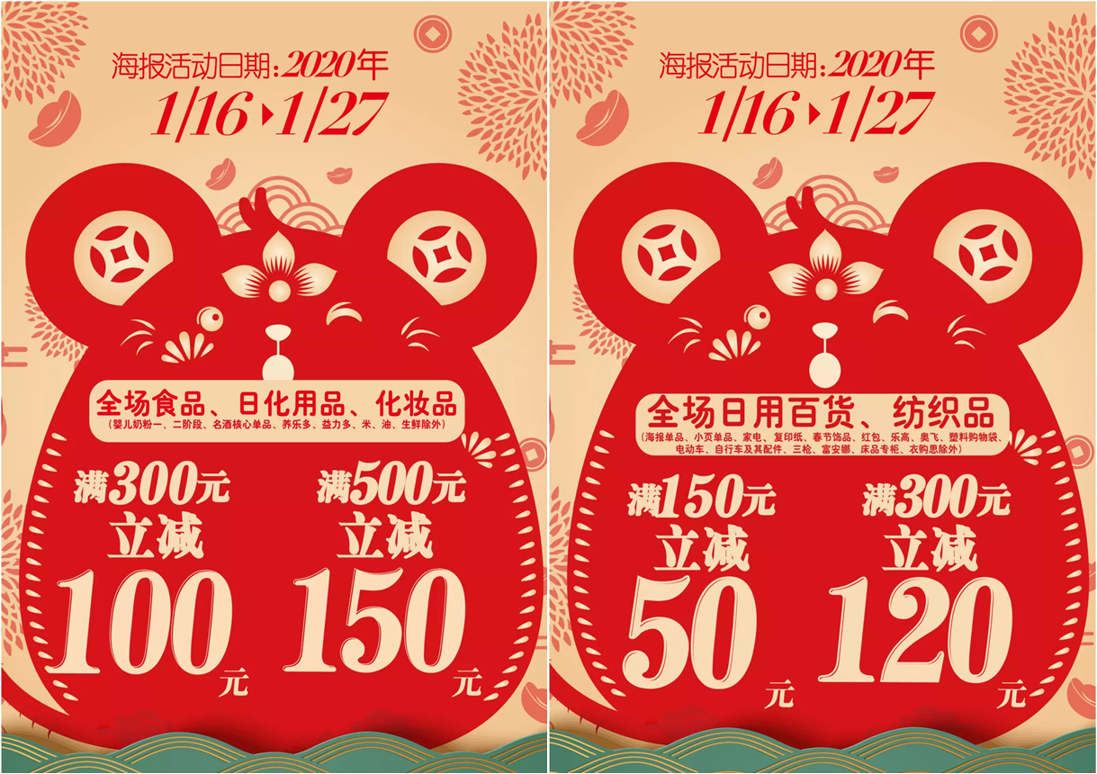 1月16日至1月27日,家樂福華南區(qū)全場食品、日化用品、化妝品滿300元立減100元,滿500元立減150元;全場日用百貨、紡織品(除家電)滿150元立減50元。細則請見家樂福店內(nèi)信息板或洽詢工作人員。