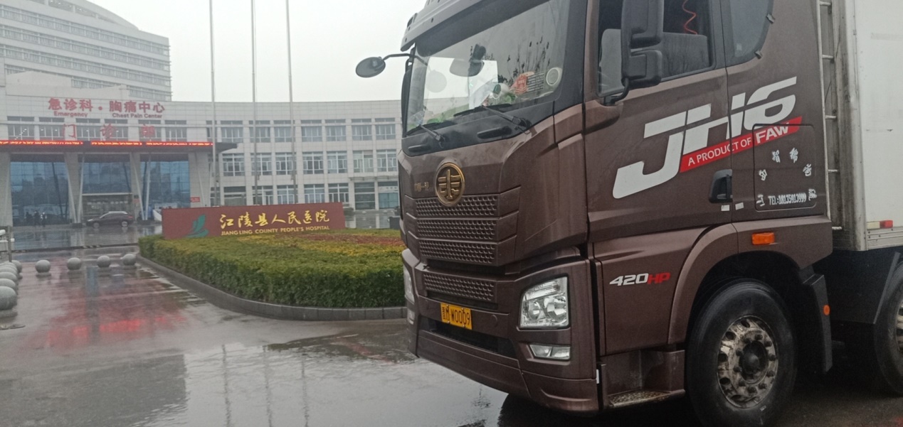 2月1日,令狐師傅連夜從南京出發(fā),滿載消毒劑、防護服、口罩、醫(yī)用手套、醫(yī)療垃圾桶等重達12噸前線急缺物資,途徑武漢、荊州、襄陽、十堰,將武漢中醫(yī)院、江陵縣人民醫(yī)院、襄陽市中西醫(yī)結(jié)合醫(yī)院三家醫(yī)院的救助物資送到后,已是2月2日晚上21點,他又直接前往十堰醫(yī)院運送手套。