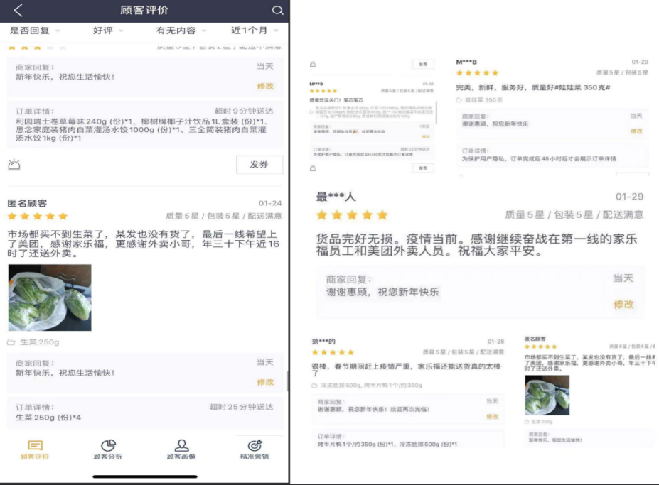 “因新型肺炎病毒的爆發(fā),從大年初二開始,蔬菜、肉類等民生用品成為了市民門的‘搶手貨’,家樂福門店的外賣平臺配送新訂單突然增長,單日訂單量突破上百,很快又到幾百,甚至更多……單個訂單的商品種類多至120件,訂單價格超過3000元,每天每個門店平均需要撥打300通以上的電話?!奔覙犯HA南區(qū)電商經(jīng)理黃福填告訴我們,面對每天逐漸增長的訂單量,自己既是喜悅又是焦慮。為了讓更多顧客享受快捷方便的家樂?!芭渌偷郊摇睒I(yè)務(wù),許多門店的伙伴跟他一樣主動放棄春節(jié)假期,堅(jiān)守一線。