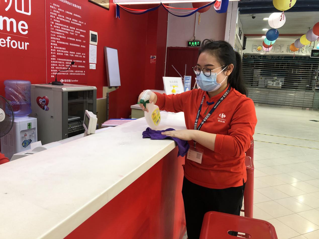 陳翠姣這次被分配到了超市收銀部門,由于是標(biāo)準(zhǔn)化操作,加上使用移動支付的顧客較多,技術(shù)難度不大,在資深員工的耐心指導(dǎo)下,她上手很快。陳翠姣表示對新崗位很滿意,她說,賦閑在家太久了,這次能換崗上任,很開心,“尤其是能夠加入到保障城市民生供應(yīng)的大型商超,非常有意義?!毕挛?點,陳翠姣為服務(wù)中心柜臺做第三次消毒清潔后,便可以結(jié)束今日的早班工作,打卡下班了。