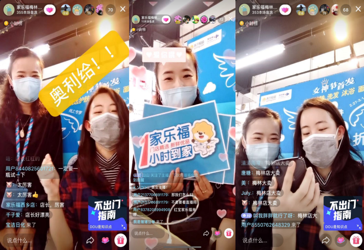 蘇寧家樂福華南區(qū)相關(guān)負(fù)責(zé)人告訴我們,袁野已經(jīng)成為家樂福的明星主播。2月8日袁野做的“直播帶貨”是蘇寧家樂福全國首場直播,一直到最近的2月29日歡樂大促直播,圍觀粉絲突破十萬更是振奮人心。目前,蘇寧家樂福華南區(qū)各城市均已推選出優(yōu)秀門店代表進(jìn)行“直播帶貨”。此外,家樂福還與多家大牌供應(yīng)商合作推出專場秒殺活動,像2月27日,家樂福深圳梅林店和家樂福廣州康王店在抖音平臺上線的“蘇寧家樂福&寶潔女神節(jié)首發(fā)直播秒殺”活動,高顏值主播加上店長親自坐陣,還有新人注冊福利大放送,使得該場直播直接沖進(jìn)了“抖音小時榜”。