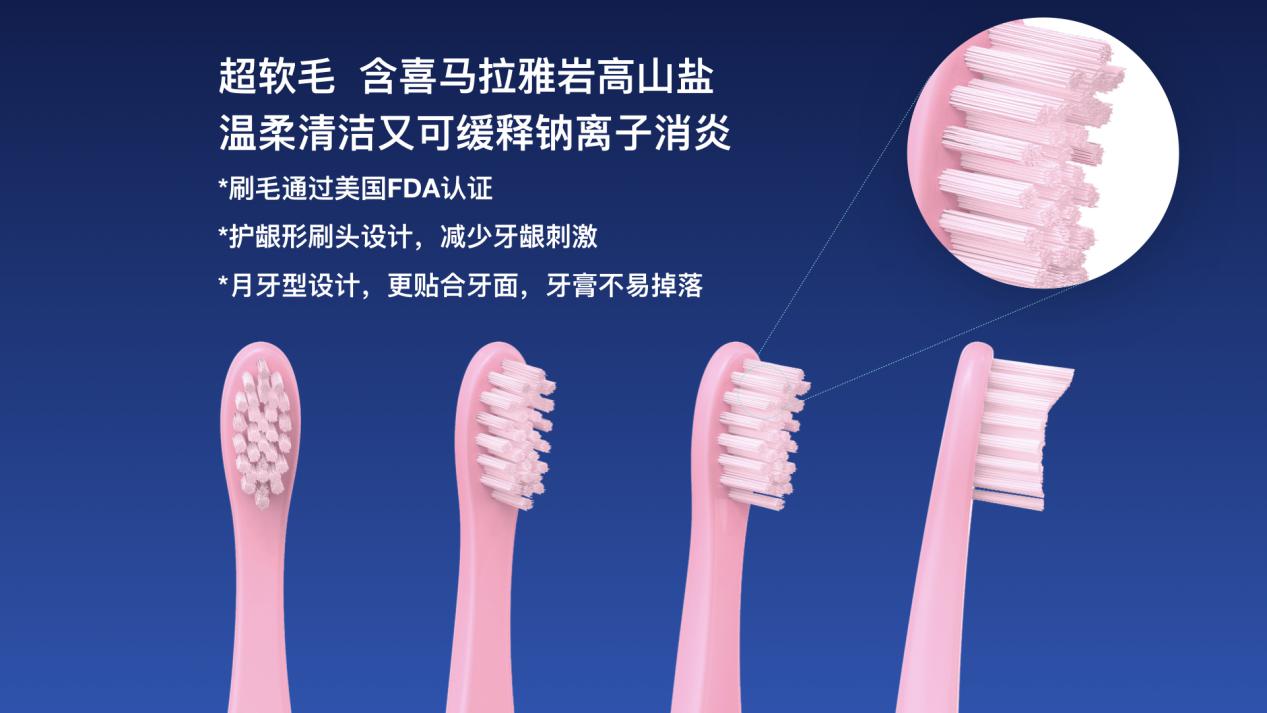 佳潔士S7000K的Q彈全包膠小刷頭,可提升刷牙安全與舒適度,安全不打牙,保護(hù)孩子細(xì)嫩的牙齒牙齦。超軟毛刷毛通過美國FDA認(rèn)證,含喜馬拉雅巖鹽健齒成分,護(hù)齦型刷頭設(shè)計(jì),減少牙齦刺激,月牙型設(shè)計(jì),更貼合牙面,清潔更到位、更安全、更舒適。