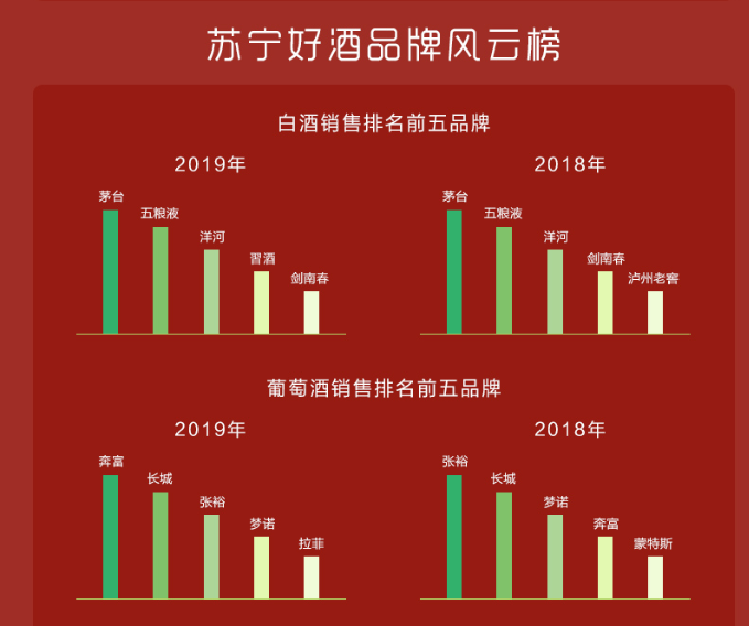 對(duì)比2018年各品牌在蘇寧的銷售表現(xiàn),則是穩(wěn)坐釣魚臺(tái)的品牌有之,長(zhǎng)江后浪推前浪的品牌有之。具體來(lái)說(shuō),茅臺(tái)、五糧液、洋河一直牢牢占據(jù)白酒品類銷售榜前三。在紅酒方面,奔富后來(lái)者居上,從2018年的第四位躍居第一位。啤酒方面,雪花、哈爾濱、青島、百威、福佳的排名無(wú)變動(dòng),而洋酒方面,馬爹利一直穩(wěn)坐第一。古越龍山也一直是黃酒品牌銷售top1。