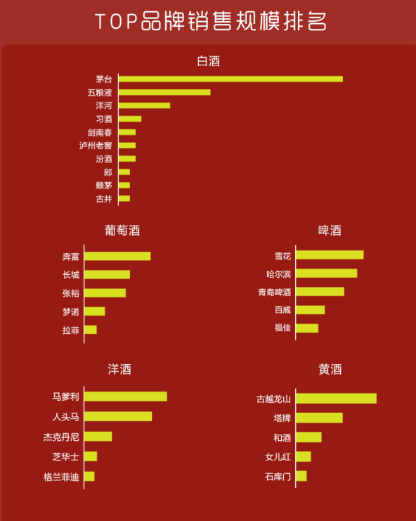 具體來(lái)說(shuō),從蘇寧超市公布的品牌銷售規(guī)模排行榜來(lái)看,茅臺(tái)、五糧液、洋河、習(xí)酒、劍南春、瀘州老窖、汾酒、郎酒、賴茅、古井成為當(dāng)之無(wú)愧的白酒品類銷售top10品牌。奔富、長(zhǎng)城、張?jiān)?、?mèng)諾、拉菲則成功問(wèn)鼎葡萄酒銷售top5,雪花、哈爾濱、青島、百威、福佳在啤酒品類中銷售表現(xiàn)最好。馬爹利、古越龍山則分別成為洋酒、黃酒品類銷售冠軍。