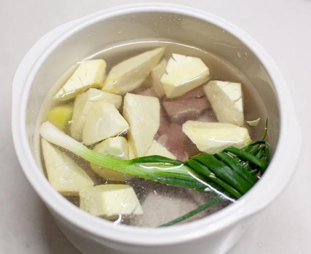 1.火腿、春筍切塊;排骨、火腿冷水下鍋,加兩片姜焯水,洗凈備用。