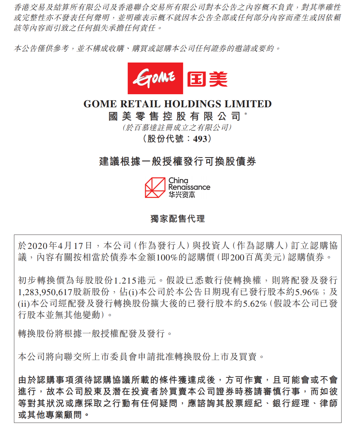 公告稱,拼多多以總計2億美金的可轉換債券方式對國美進行戰(zhàn)略投資。根據協議,初步股份轉換價為每股1.215港元,分別較國美零售2020年4月17日收盤價及截至2020年4月16日前五個連續(xù)交易日之平均收盤價溢價66.44%及68.75%。