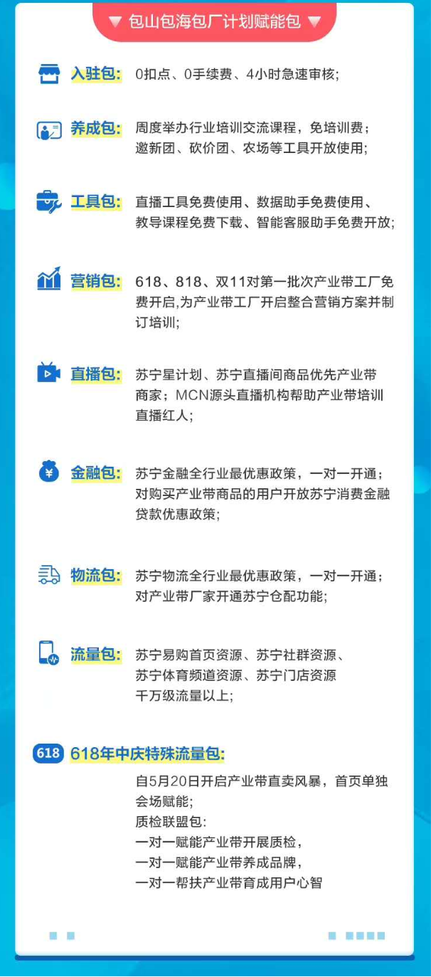 為了扶助產(chǎn)業(yè)帶商戶快速成長,蘇寧拼購發(fā)布了“包山包海包廠”賦能包,從物流、金融、營銷、直播、工具等多個(gè)角度扶助產(chǎn)業(yè)帶商戶。