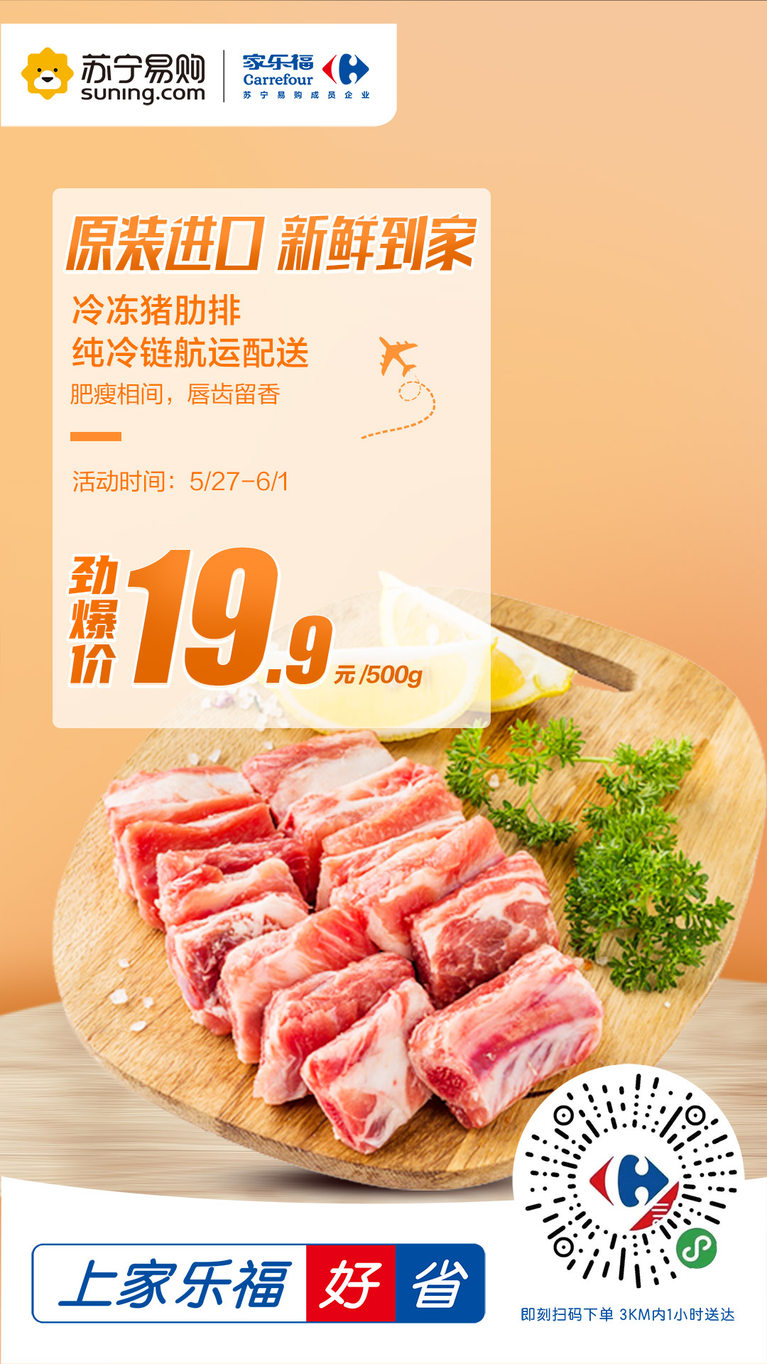 進(jìn)口冷凍豬肋排是本次活動的主推爆品之一。生豬按照歐盟標(biāo)準(zhǔn)養(yǎng)殖,采用非轉(zhuǎn)基因飼料喂養(yǎng),全程不使用抗生素,原廠精切,采用純冷鏈航運(yùn)配送,全程可溯源。肥瘦相間,讓人唇齒留香。豬肉價(jià)格高企的背景下,這款進(jìn)口豬肋排原價(jià)39.9元/500g,活動期間僅售19.9元/500g,價(jià)格十分惠民,絕對是秒殺爆品。此外,家樂福還準(zhǔn)備了澳洲黃牛肉36.8元/斤、帶皮后腿肉19.9元/斤、小龍蝦19.9元/盒、波士頓龍蝦+三文魚的組合預(yù)售。誠意滿滿,只為滿足“食肉獸”的大胃口!