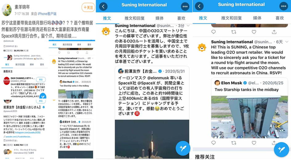 一個(gè)馬斯克,一個(gè)前澤友作,這趟萬(wàn)眾矚目的繞月之旅原本跟我們國(guó)內(nèi)是沒什么關(guān)系的,但因?yàn)樘K寧的出現(xiàn)突然有了轉(zhuǎn)機(jī)。有微博用戶爆料,蘇寧7月中時(shí)候就在推特向馬斯克及前澤友作分別拋出合作求繞月旅行船票的橄欖枝。