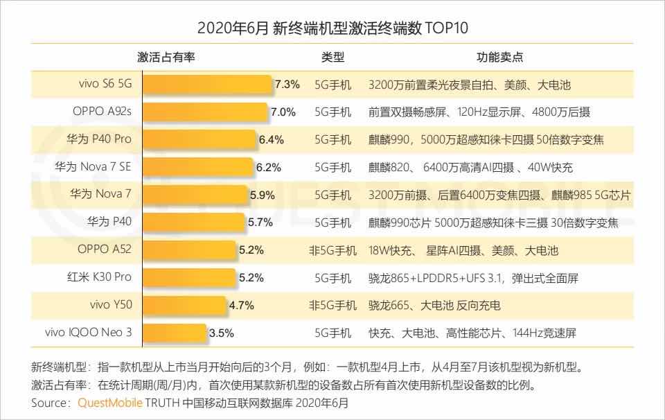 近期發(fā)布的《QuestMobile中國移動互聯(lián)網(wǎng)2020半年大報告》顯示,“2020年6月新終端機型激活終端數(shù)Top10”的榜單中vivo S系列首款5G手機——vivo S6憑借3200萬(像素)前置柔光夜景自拍、美顏(功能)及大電池榮登榜首。值得一提的是,S6的迭代機型vivo S7目前也已經(jīng)曝光,將于8月3日正式發(fā)布。
