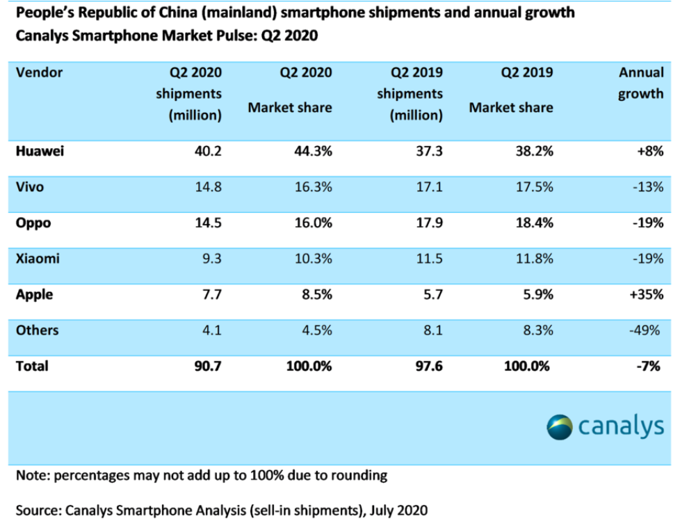 見圳客戶端·深圳新聞網(wǎng)2020年8月3日訊 知名調(diào)研公司Canalys發(fā)布的最新數(shù)據(jù)顯示,盡管與2019年第二季度相比市場萎縮了7%,但中國智能手機市場的季度環(huán)比增長了25%,在2020年第二季度達到9000多萬臺。