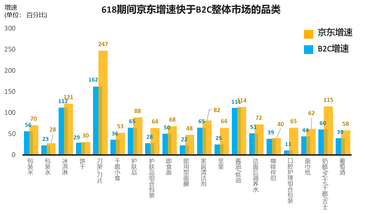 尼爾森618期間監(jiān)測(cè)的快消品類數(shù)據(jù)發(fā)現(xiàn),京東增速超過市場(chǎng)整體增速,從細(xì)分品類分析,618期間以食品為代表的大量民生品類在京東增速明顯超越大盤,充分展示了消費(fèi)者對(duì)于京東平臺(tái)的信賴。京東大數(shù)據(jù)則顯示在2020年上半年已經(jīng)有超過10000個(gè)品牌在京東超市實(shí)現(xiàn)成交額同比增長(zhǎng)100%,7000個(gè)品牌實(shí)現(xiàn)成交額同比增長(zhǎng)200%,5000個(gè)品牌實(shí)現(xiàn)成交額同比增長(zhǎng)300%,有200個(gè)品牌實(shí)現(xiàn)成交額超億元,超20個(gè)品牌實(shí)現(xiàn)成交額超10億。