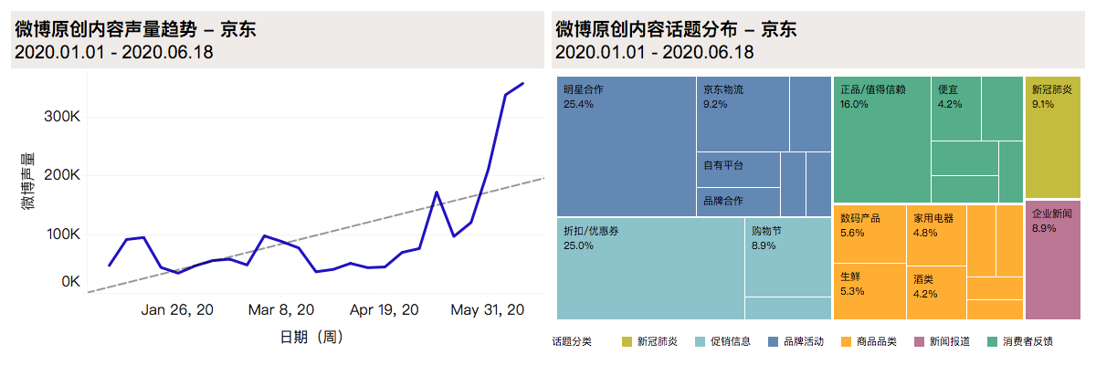 6月與疫情相關(guān)的話題內(nèi)容已降至全部話題的3%,表明用戶對(duì)疫情的關(guān)心已逐漸轉(zhuǎn)回到京東平臺(tái)核心功能上,即平臺(tái)的電商本質(zhì)。在用戶體驗(yàn)方面的反饋中,提及“京東值得信賴”的內(nèi)容占比近45%。京東在疫情爆發(fā)期間包括物資捐贈(zèng),醫(yī)療物資運(yùn)輸?shù)仍趦?nèi)的舉措使京東得到了社交媒體用戶的肯定與贊揚(yáng)。在618購物節(jié)開始后,用戶對(duì)京東平臺(tái)的討論也更多集中在“平臺(tái)大”、“信得過”等方面。