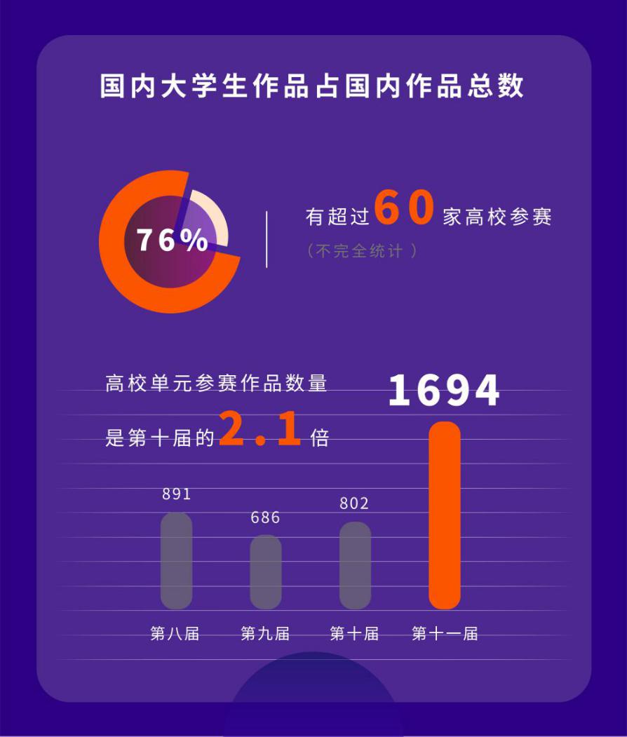 作為參與金鵬短片導(dǎo)演扶持計劃的重要力量,今年高校大學(xué)生的參賽積極性持續(xù)高漲。本屆短片節(jié)發(fā)起的“全國大學(xué)生視頻創(chuàng)意大賽”共收到來自全國超過60所高校的1694部參賽作品,數(shù)量同比增長一倍。國內(nèi)大學(xué)生參賽作品數(shù)量在所有國內(nèi)參賽作品總數(shù)中占比58%,大學(xué)生創(chuàng)作者一躍成為金鵬短片導(dǎo)演扶持計劃的中堅力量,凸顯了新時代下年輕創(chuàng)作者對短片以及短視頻的無限熱情和興趣執(zhí)著。大學(xué)生競賽單元將分別評選出“最佳大學(xué)生短片”、“最佳大學(xué)生劇情短片”、“最佳大學(xué)生紀錄短片”、“最佳大學(xué)生動畫短片”、“最佳大學(xué)生VLOG短片”、“最佳大學(xué)生科普短片”、“最佳大學(xué)生廣告創(chuàng)意短片”、“最佳大學(xué)生原創(chuàng)音樂短片”等9大類型入圍優(yōu)秀作品。
